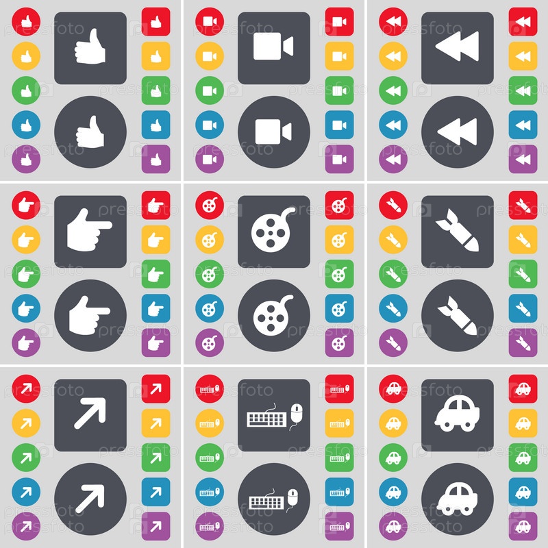 Так, кинокамера, Rewind, рука, видеозапись, ракета, полный экран, клавиатура, автомобиль значок символа. большой набор плоских цветных кнопок для вашего дизайна. вектор