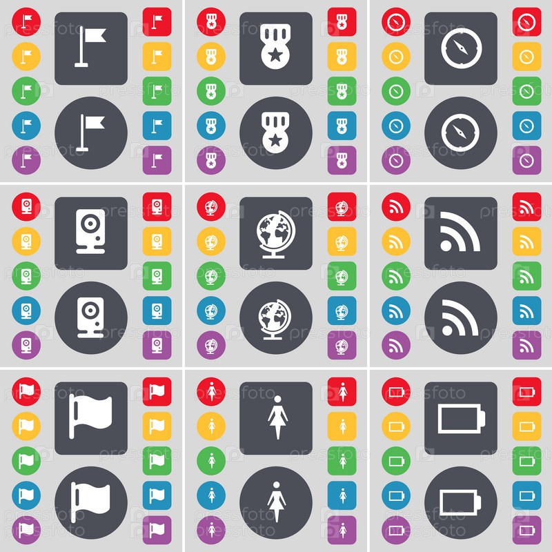 Дверь для гольфа, медальон, компас, спикер, глобус, RSS, флаг, силуэт, значок символа батареи Большой набор плоских цветных кнопок для вашего дизайна. вектор