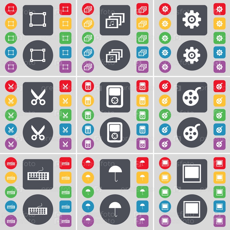 Рама, галерея, снаряжение, ножницы, игрок, видеозапись, клавиатура, зонтик, окна значок символа. Большой набор плоских, цветные кнопки для вашего дизайна. Вектор