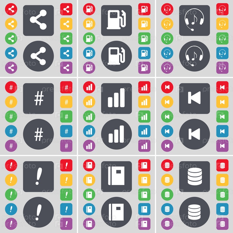 Доля, автозаправочная станция, наушники, Hashtag, диаграмма, СМИ пропустить, восклицательный знак, ноутбук, символ значка базы данных. Большой набор плоских цветных кнопок для вашего дизайна. вектор