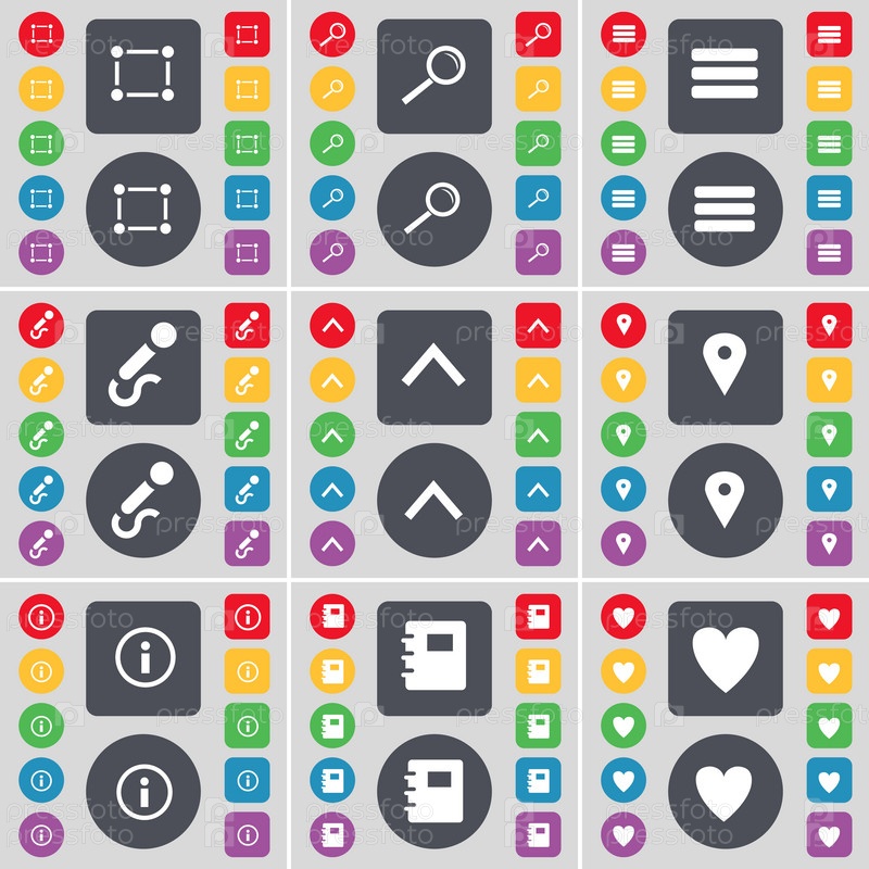 Рама, увеличительное стекло, приложения, микрофон, стрелка вверх, контрольно-пропускная точка, информация, ноутбук, символ иконы сердца. большой набор плоских цветных кнопок для вашего дизайна. вектор