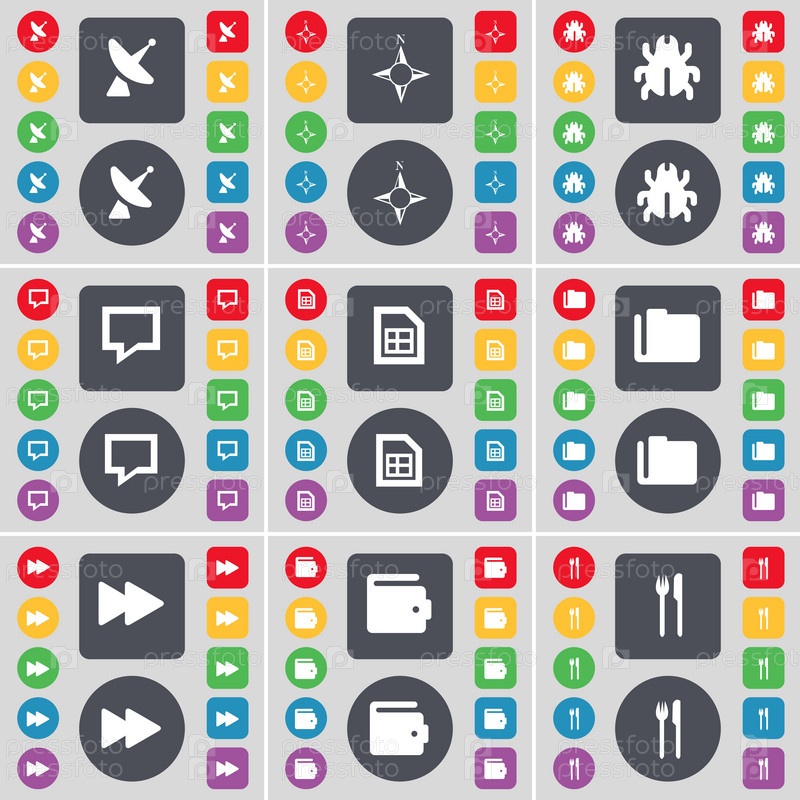 Спутниковая тарелка, компас, ошибка, пузырь чата, файл, папка, Rewind, кошелек, вилка и нож значок символа. Большой набор плоских цветных кнопок для вашего дизайна. вектор