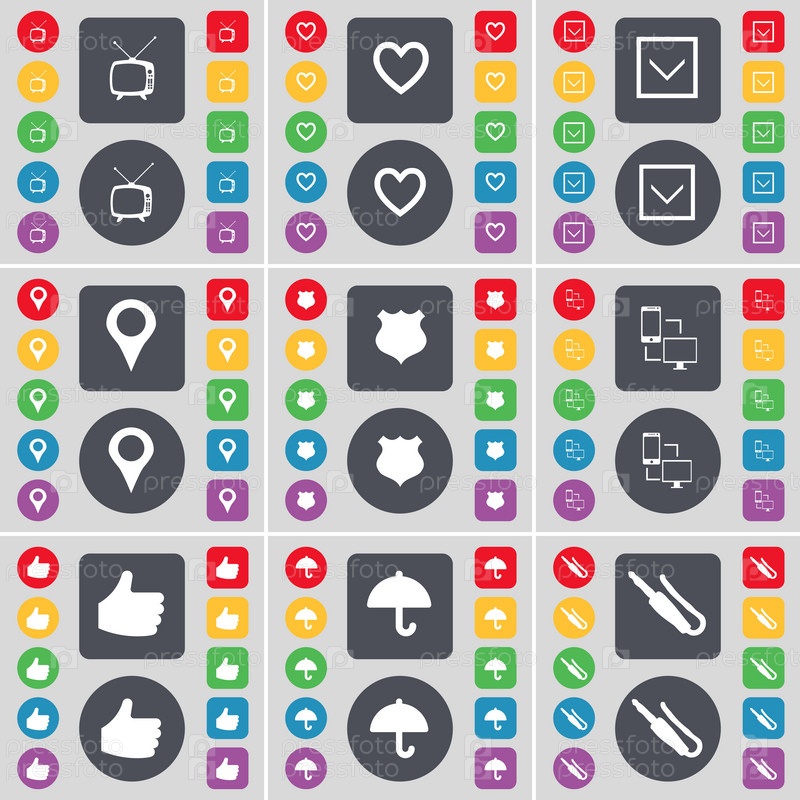 Ретро ТВ, сердце, стрелка вниз, контрольно-пропускной пункт, полиции значок, Обмен информацией, как, зонтик, микрофон разъем значок символа. Большой набор плоских, цветные кнопки для вашего дизайна. Вектор