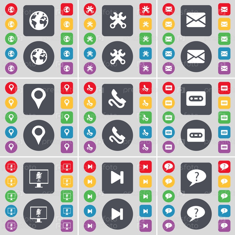 Земля, гаечные ключи, сообщение, контрольно-пропускной пункт, приемник, кассеты, монитор, СМИ пропустить, чат облако значок символа. Большой набор плоских, цветные кнопки для вашего дизайна. Вектор