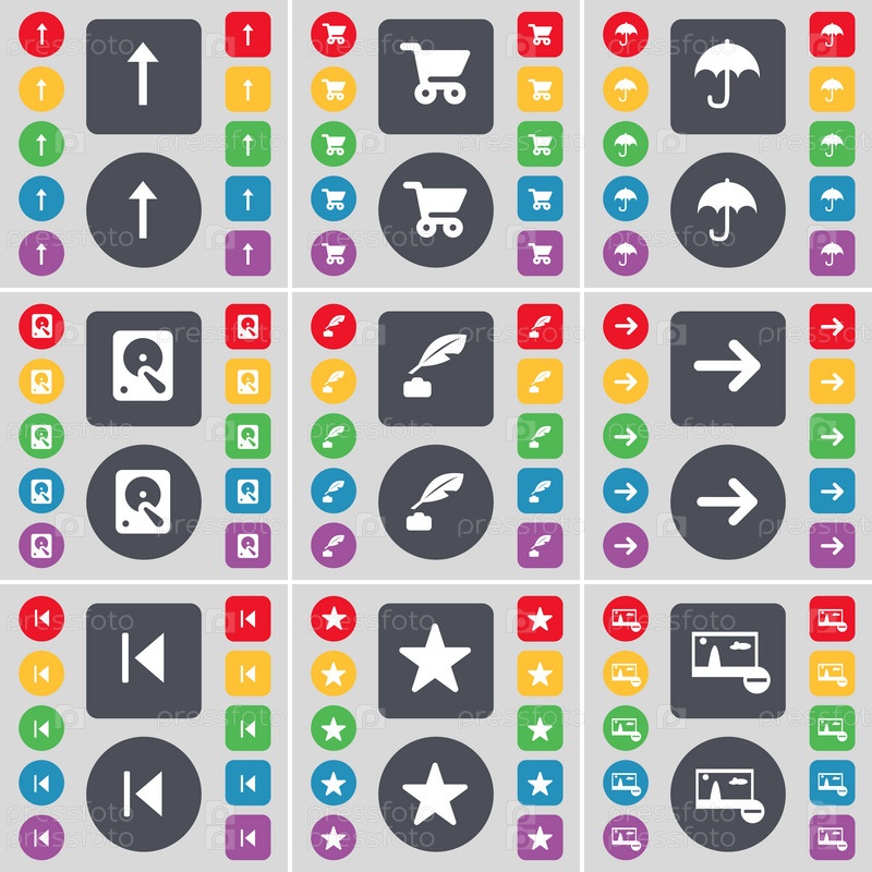 Стрелка вверх, торговых тележка, зонтик, жесткий диск, чернильница, стрелка вправо, пропустить СМИ, звезда, картинка значок символ. Большой набор плоских, цветные кнопки для вашего дизайна. Вектор