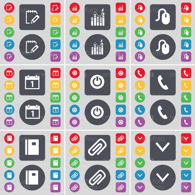 Обследование, граф, мышь, календарь, мощности, приемника, ноутбук, клип, стрелка вниз значок символа. Большой набор плоских, цветные кнопки для вашего дизайна. Вектор