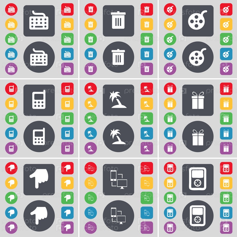 Клавиатура, мусор может записывать видео, мобильный телефон, пальма, подарок, ручная работа, обмен информацией, игрок значок символа. большой набор плоских цветных кнопок для вашего дизайна. вектор