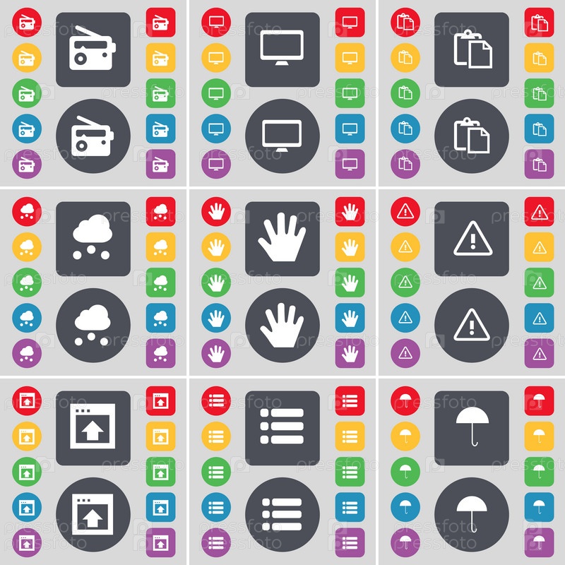 Радио, монитор, обследования, облако, рука, предупреждение, окна, список, зонтик значок символа. Большой набор плоских, цветные кнопки для вашего дизайна. Вектор
