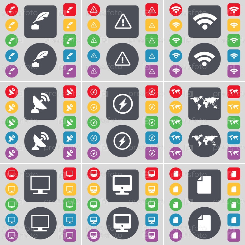 Чернила горшок, предупреждение, Wi-Fi, спутниковая тарелка, Флэш, глобус, монитор, символ файл значок. большой набор плоских цветных кнопок для вашего дизайна. вектор
