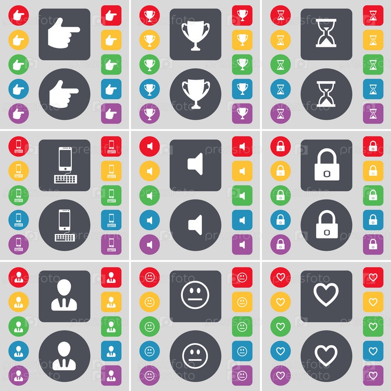 Рука, Кубок, Песочные часы, смартфон, звук, замок, аватар, улыбка, сердце значок символа. Большой набор плоских, цветные кнопки для вашего дизайна. Вектор