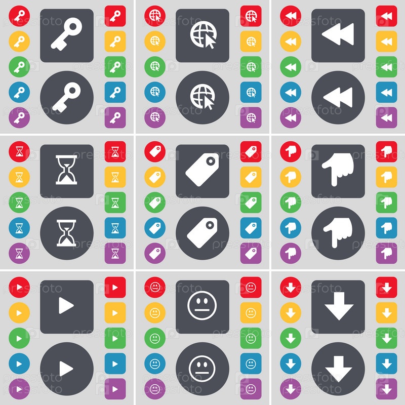 Ключ, Веб с курсором, Rewind, Песочные часы, теги, руки, медиа играть, улыбка, стрелка вниз значок символа. Большой набор плоских цветных кнопок для вашего дизайна. вектор