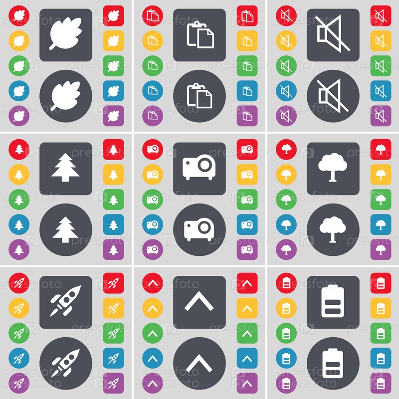 Лист, исследования, молчание, елка, проектор, стрелка вверх, значок символа батареи Большой набор плоских цветных кнопок для вашего дизайна