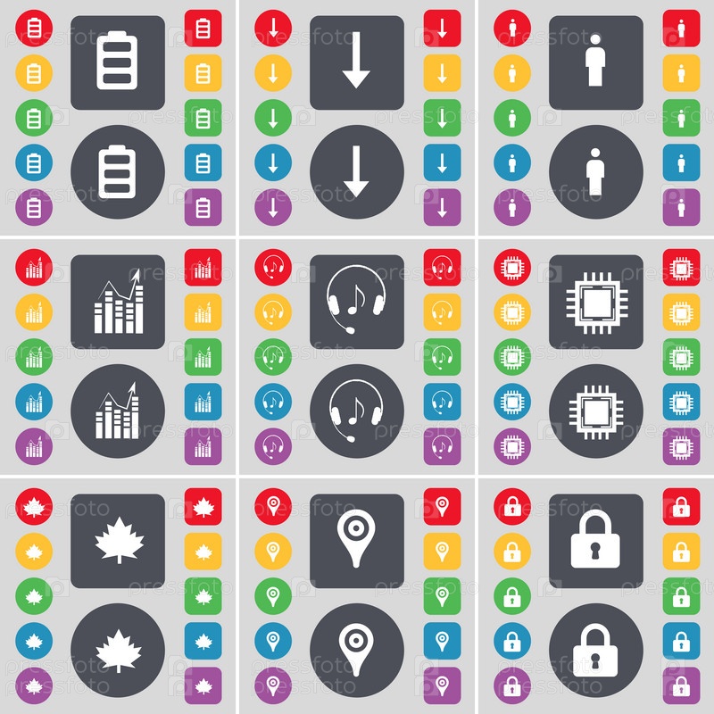 Аккумулятор, стрелка вниз, силуэт, граф, наушники, процессор, кленовый лист, контрольно-пропускной пункт, значок символ блокировки. Большой набор плоских, цветные кнопки для вашего дизайна. Вектор