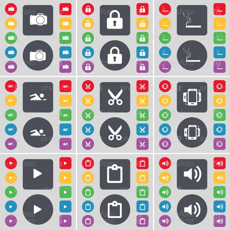 Камеры, замок, сигареты, пловец, ножницы, смартфон, средства массовой информации играть, обследования, символ значок звука. Большой набор плоских, цветные кнопки для вашего дизайна. Вектор
