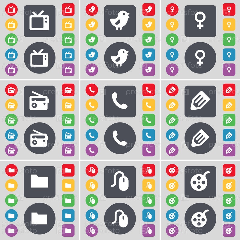 Венера Ретро ТВ, птица, символ, Радио приемник, карандаш, папка, мышь, видеозапись значок символа. Большой набор плоских, цветные кнопки для вашего дизайна. Вектор