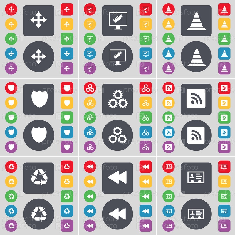 Перемещение, монитор, конус, знак, снаряжение, RSS, переработка, Rewind, символ значка контакта. большой набор плоских цветных кнопок для вашего дизайна. вектор