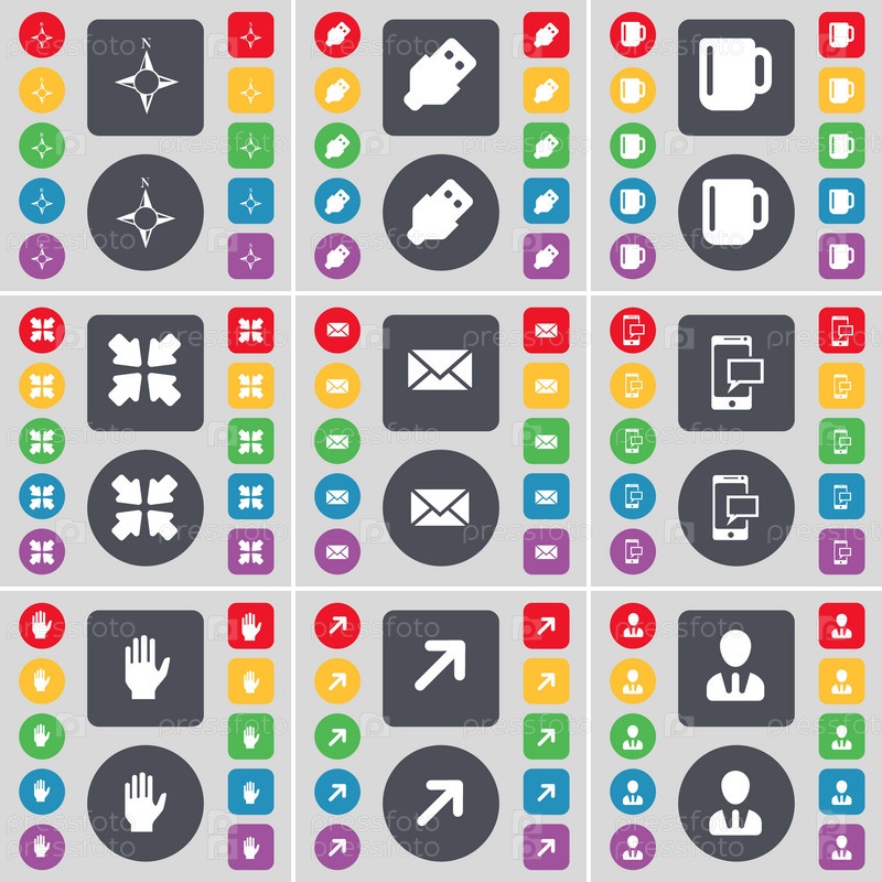 Компас, USB, Кубок, развертывание экрана, сообщения, SMS, рука, полный экран, символ значка аватара. Большой набор плоских цветных кнопок для вашего дизайна. вектор