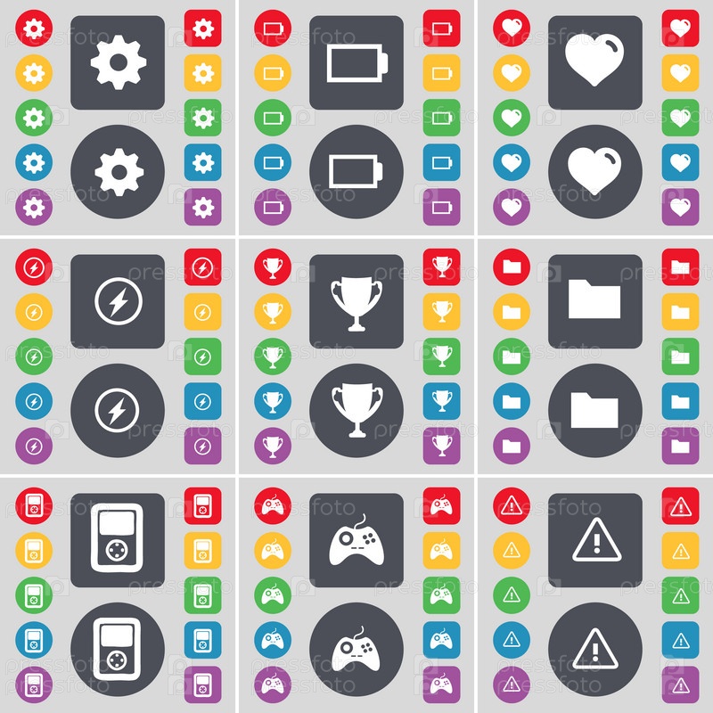 Оборудование, батарея, сердце, Флэш, Кубок, папка, игрок, геймпад, предупреждение значок символа. большой набор плоских цветных кнопок для вашего дизайна. вектор