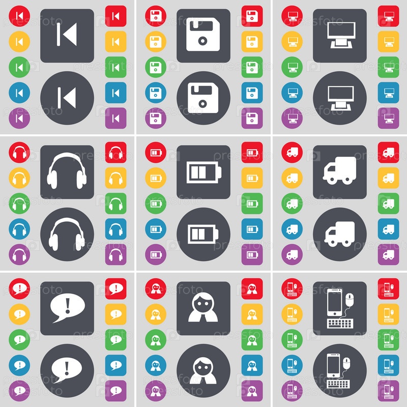 Средства массовой информации пропустить, флоппи, монитор, наушники, батарея, грузовик, чат пузырь, аватар, смартфон значок символа. Большой набор плоских, цветные кнопки для вашего дизайна. Вектор