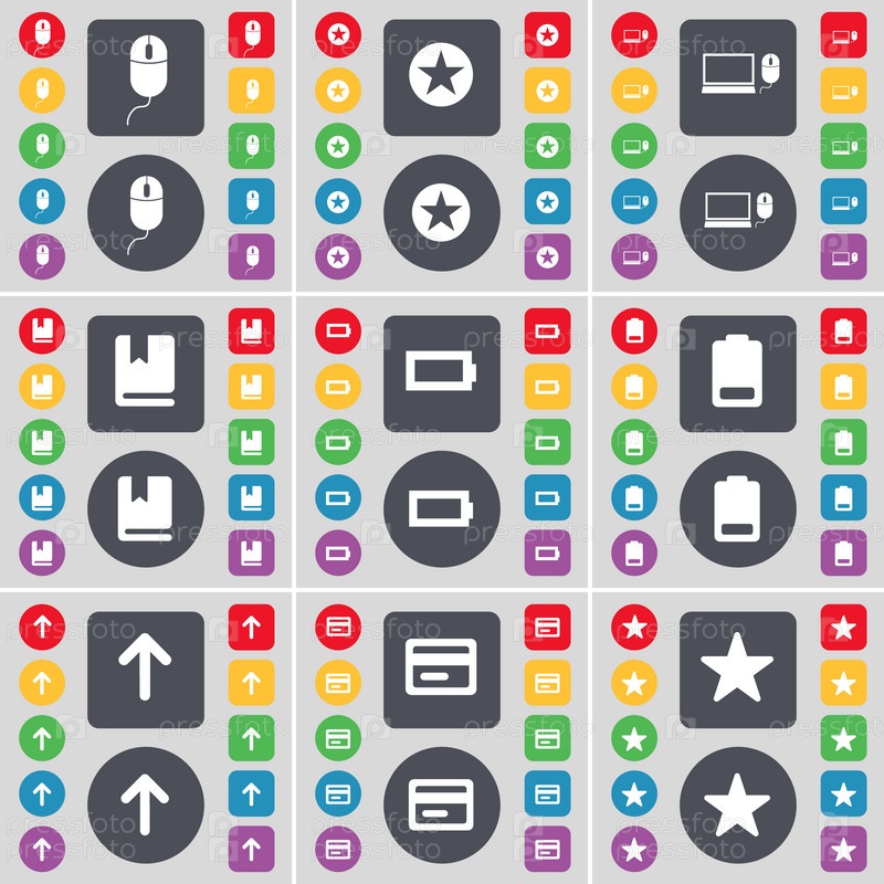 Мышь, звезда, ноутбук, словарь, батарея, стрелка вверх, кредитных карт, звезда значок символа. Большой набор плоских, цветные кнопки для вашего дизайна. Вектор