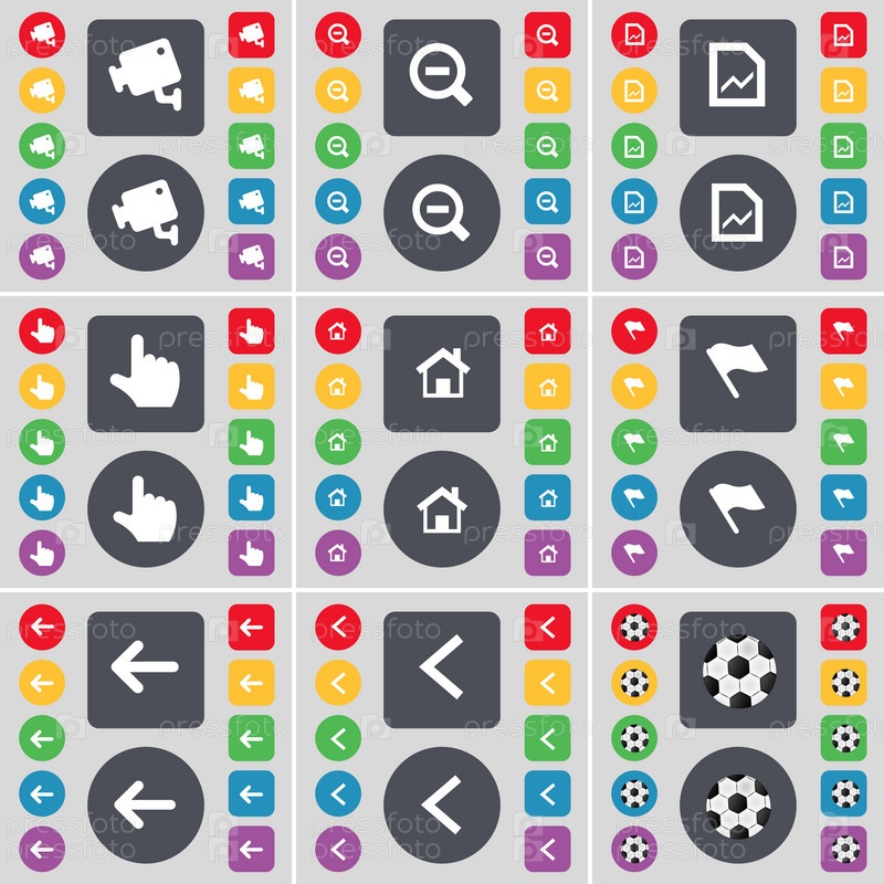 CCTV, минус, граф, рука, дом, флаг, стрелка слева, значок символа мяча.Большой набор плоских цветных кнопок для вашего дизайна.Вектор