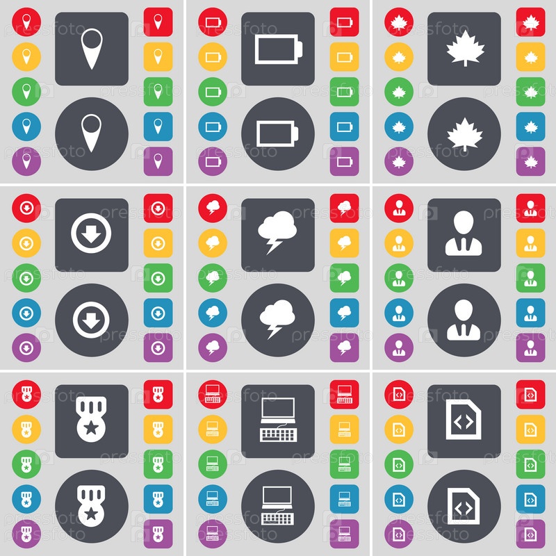 Контрольно-пропускной пункт, батарея, кленовый лист, стрелка вниз, молния, аватар, медаль, ноутбук, символ файл значка. Большой набор плоских, цветные кнопки для вашего дизайна. Вектор