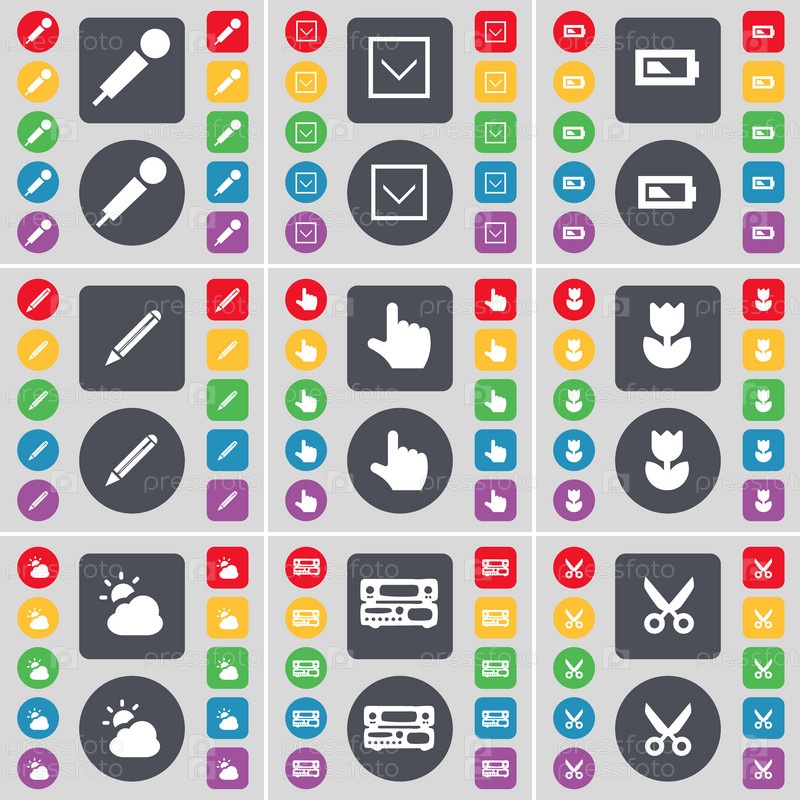 Микрофон, стрелка вниз, батарея, карандаш, рука, цветок., облако, ножницы значок символа, рекорд плеер. Большой набор плоских, цветные кнопки для вашего дизайна. Вектор