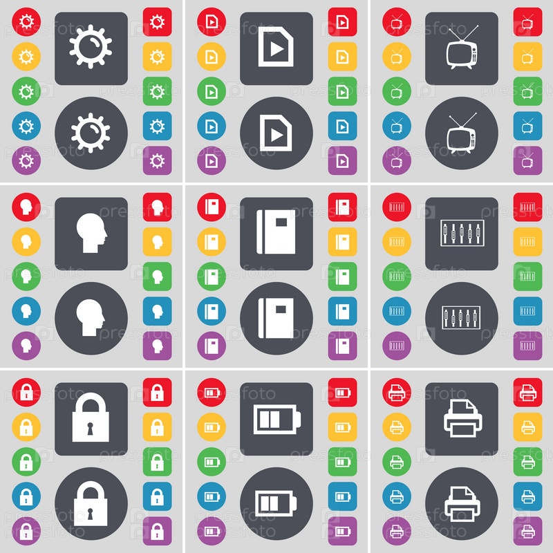 Регуляторы, мультимедийные файлы, ретро-телевизор, силуэт, ноутбук, эквалайзер, замок, батареи, символ иконки принтера. Большой набор плоских цветных кнопок для вашего дизайна. вектор