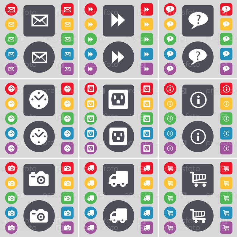 SMS, Rewind, чат-пузырь, часы, розетка, информация, камера, грузовик, торговый корзину значок символа. большой набор плоских цветных кнопок для вашего дизайна. вектор