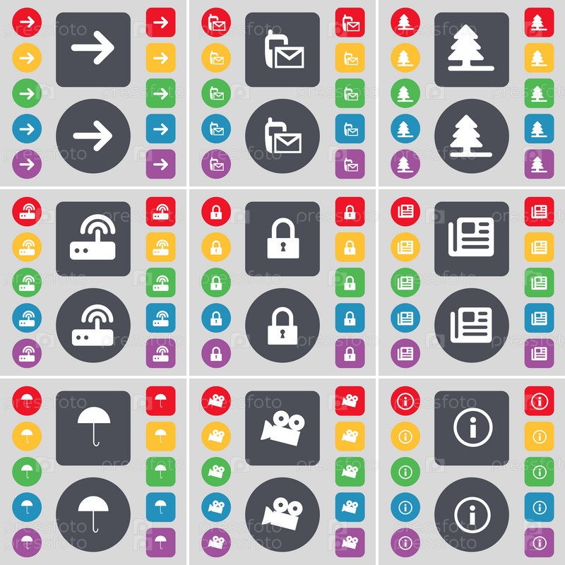 Стрелка направо, SMS, ёлочка, маршрутизатор, замок, газета, зонтик, пленочная камера, информация значок символа. большой набор плоских цветных кнопок для вашего дизайна. вектор