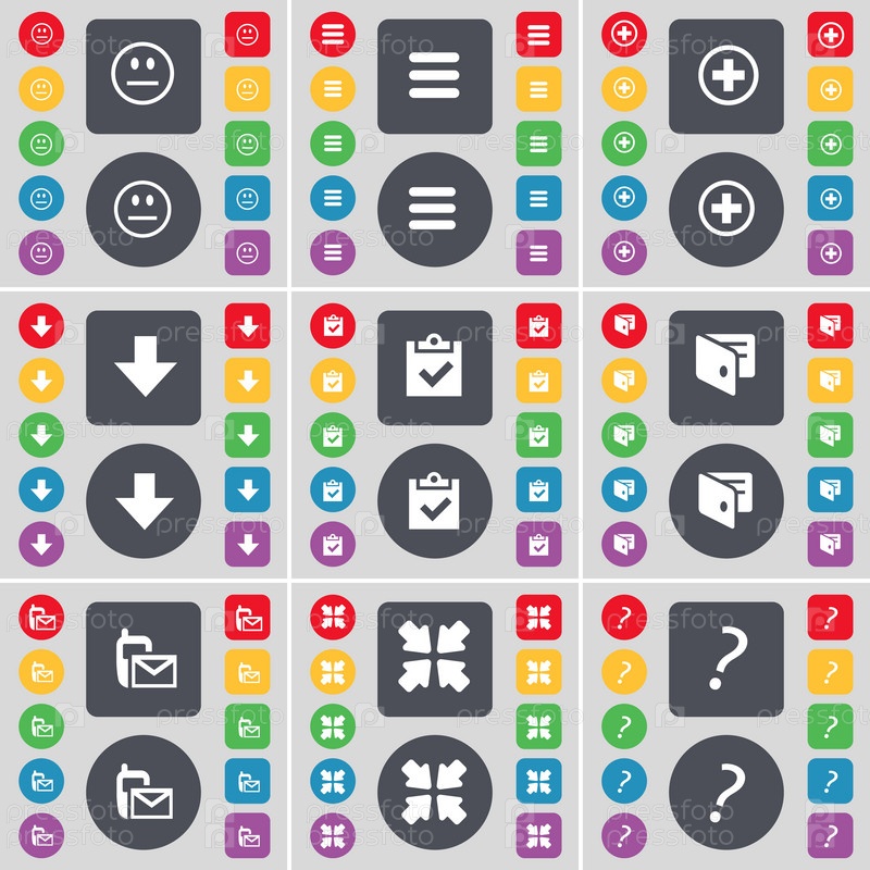 Улыбка, Приложения, плюс, стрелка вниз, опросы, кошелек, SMS, раскрытие экрана, значок символа вопросительного знака. Большой набор плоских цветных кнопок для вашего дизайна. вектор