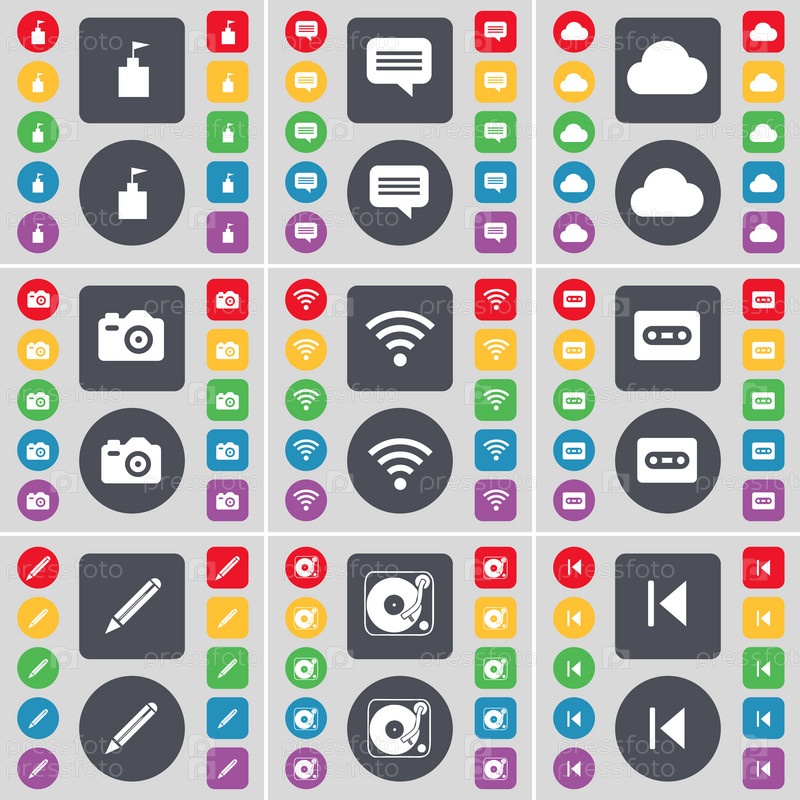 Башня флага, пузырь чата, облако, камера, Wi-Fi, кассеты, карандаш, граммофон, СМИ показывают значок символа. Большой набор плоских цветных кнопок для вашего дизайна. вектор