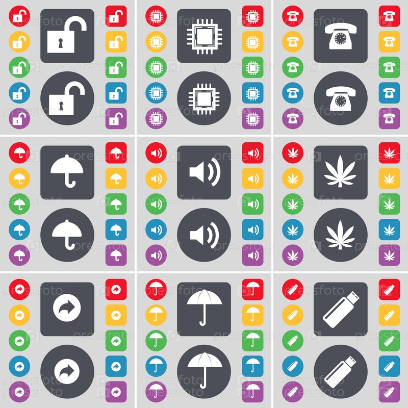 Замок, процессор, ретро-телефон, зонтик, звук, марихуана, спинка, зонтик, значок символа USB. Большой набор плоских цветных кнопок для вашего дизайна. вектор