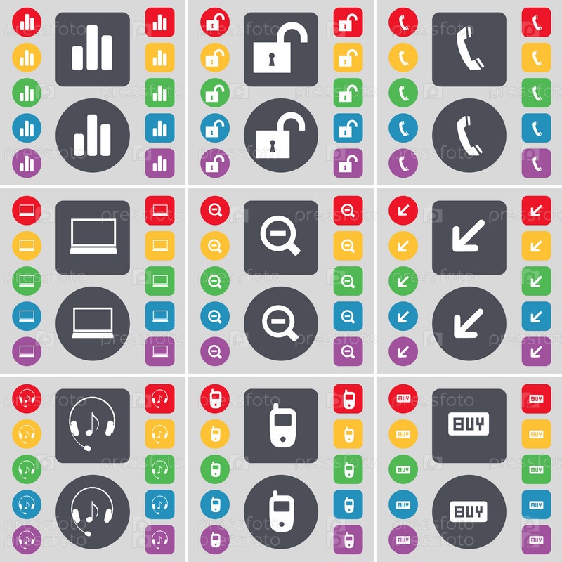 Диаграмма, замок, приемник, ноутбук, минус, развертывание экран, наушники, мобильный телефон, Купить значок символа. Большой набор плоских, цветные кнопки для вашего дизайна. Вектор