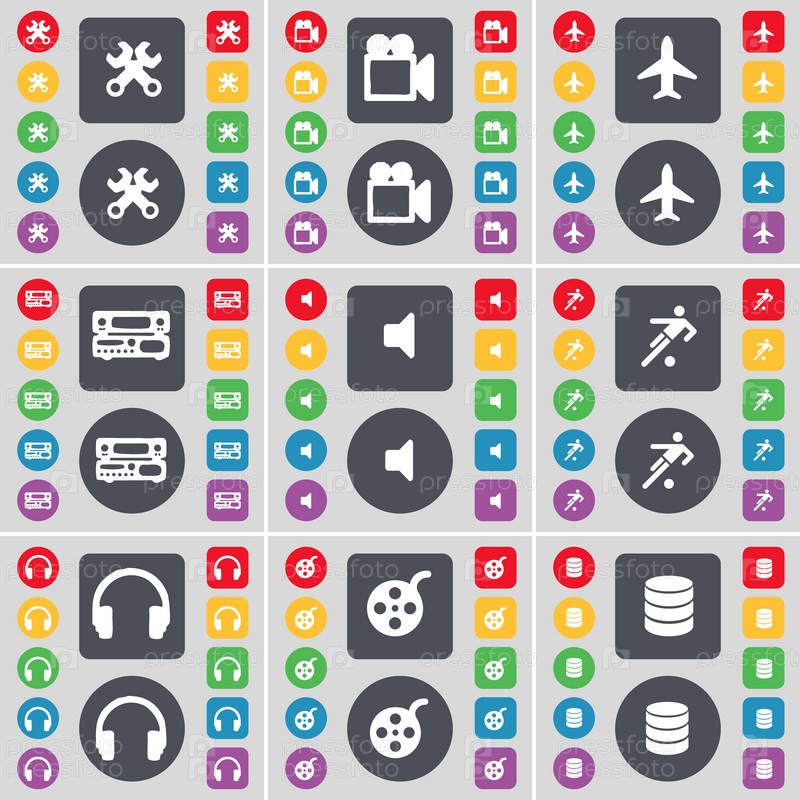 Гаечный ключ, пленочной камеры, самолет,-проигрыватель, звук, футбол, наушники, видеозапись, символ значок базы данных. Большой набор плоских, цветные кнопки для вашего дизайна. Вектор