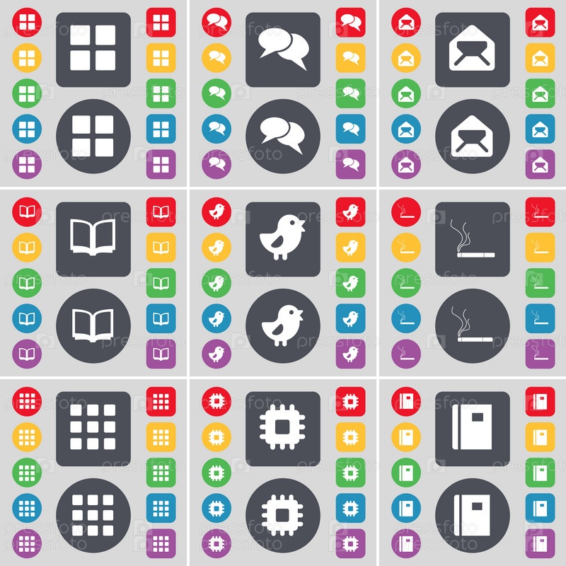 Приложения, чат, сообщения, книга, птица, сигареты, приложения, процессор, значок символа блокнот. Большой набор плоских цветных кнопок для вашего дизайна. вектор