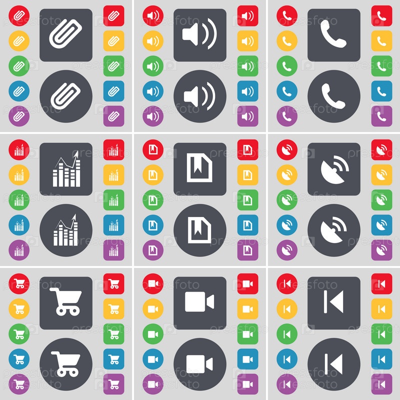 Клип, звук, приемник, граф, файл, Спутниковое блюдо, корзина, пленочной камеры, СМИ показывать значок символ. Большой набор плоских, цветные кнопки для вашего дизайна. Вектор