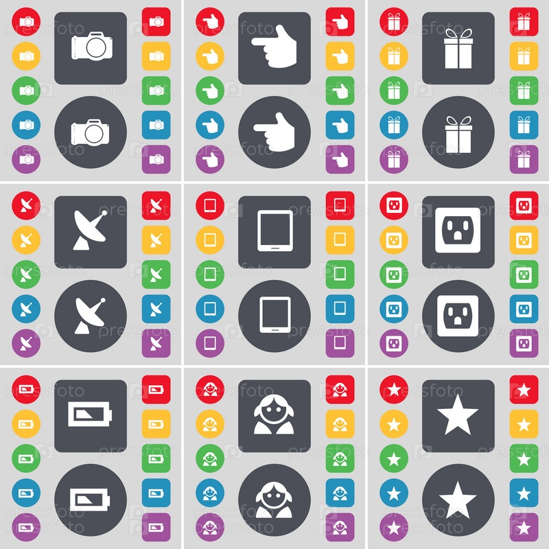 Камера, рука, подарок, Спутниковая тарелка, Таблетный ПК, розетка, батарея, аватар, символ значка звезды. Большой набор плоских цветных кнопок для вашего дизайна. вектор
