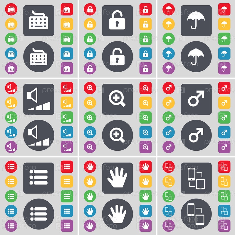 Клавиатуры, блокировки, зонтик, объем, увеличительное стекло, Марс символ, список, рука, подключения значок символа. Большой набор плоских, цветные кнопки для вашего дизайна. Вектор
