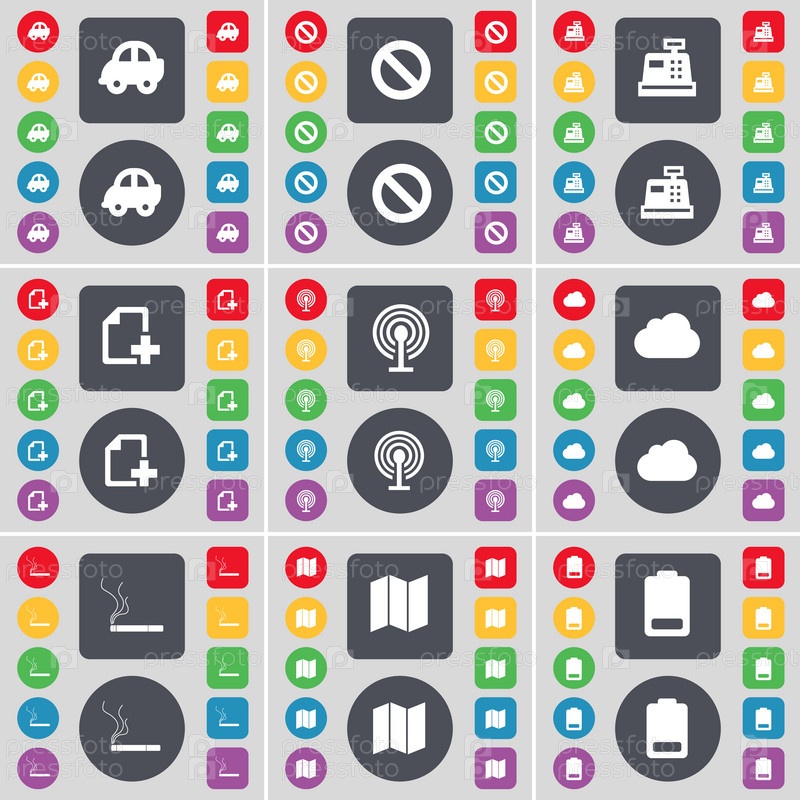 Автомобиль, остановка, касса, файл, Wi-Fi, облако, сигареты, карта, значок символ батарей. Большой набор плоских цветных кнопок для вашего дизайна. вектор