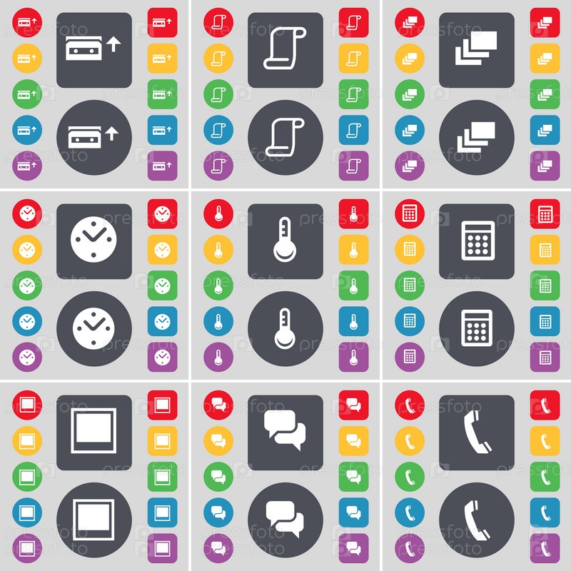 Кассета, прокрутки, галерея, часы, термометр, калькулятор, окно, чат, приемник значок символа. Большой набор плоских, цветные кнопки для вашего дизайна. Вектор