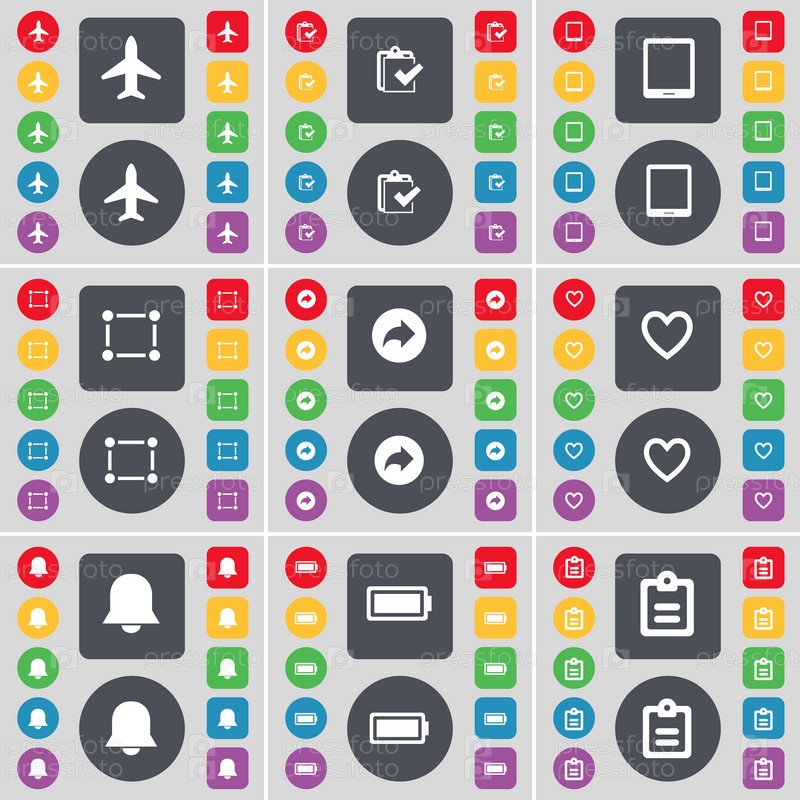 Самолет, обследование, планшетный ПК, рама, спинки, сердце, бесплатное, батареи, иконка символа исследования. большой набор плоских цветных кнопок для вашего дизайна. вектор