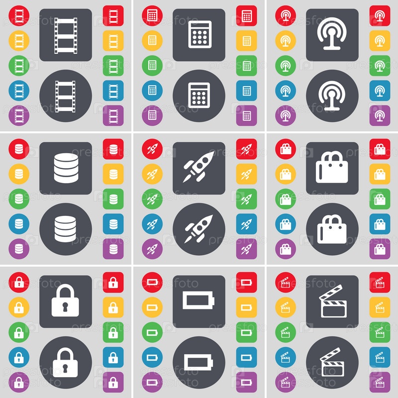 Видеозапись, калькулятор, Wi-Fi, базы данных, ракета, покупательский мешок, блокировка, батарея, иконка символа Clapper. большой набор плоских цветных кнопок для вашего дизайна. вектор