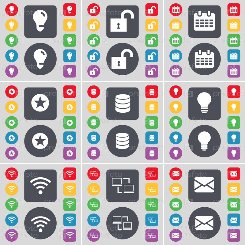 Лампы, замок, календарь, звезда, базы данных, лампочки, Wi-Fi, подключение, символ значка сообщения. большой набор плоских цветных кнопок для вашего дизайна. вектор
