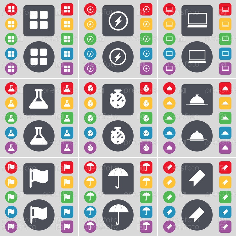 Приложения, Флэш, ноутбук, флаг, секундомер, лоток, флаг, зонтик, значок символа маркера. Большой набор плоских цветных кнопок для вашего дизайна. вектор