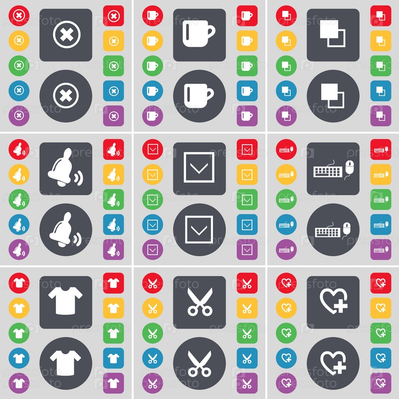 Стоп, Кубок, копирования, Белл, стрелка вниз, клавиатура, футболку, ножницы, сердце значок символа. Большой набор плоских, цветные кнопки для вашего дизайна. Вектор