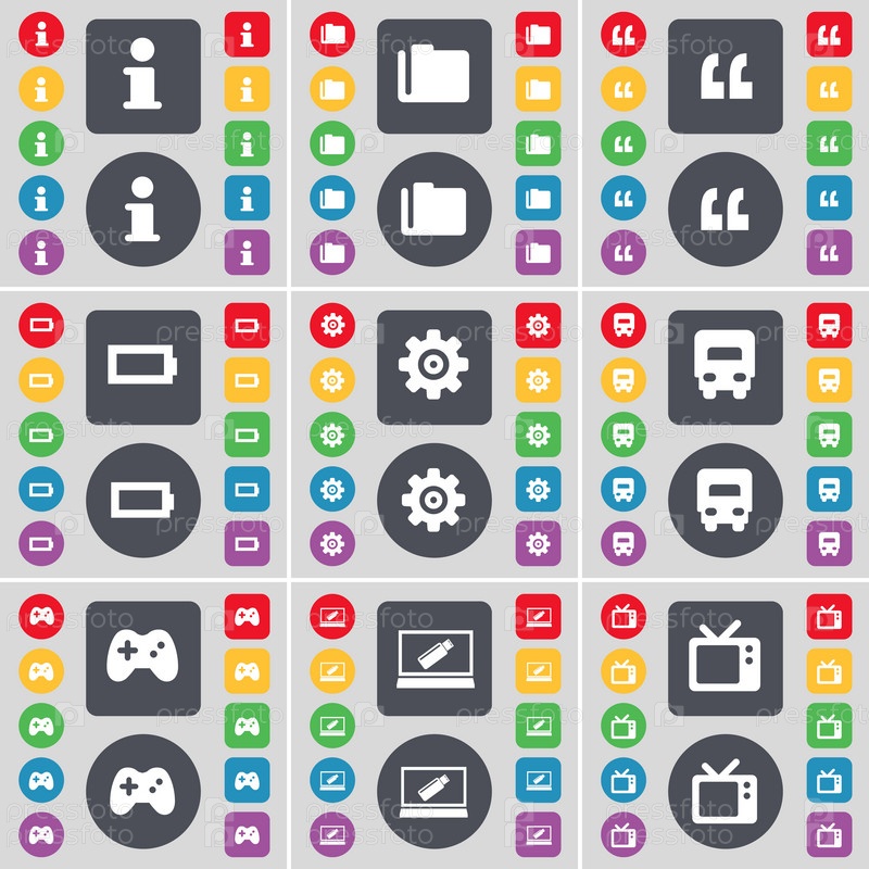 Информация, папка, кавычки, батарея, снаряжение, грузовик, геймпад, ноутбук, Ретро ТВ значок символ. Большой набор плоских, цветные кнопки для вашего дизайна. Вектор
