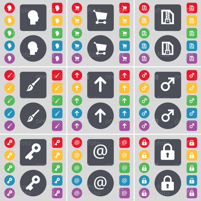 Силуэт, корзина, ZIP-файл, кисть, стрелка вверх, символ Марса, ключ, почта, иконка замка. Большой набор плоских цветных кнопок для вашего дизайна. вектор