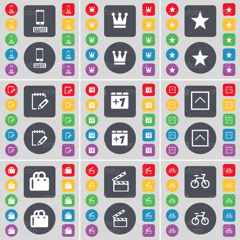 Смартфон, Корона, звезда, обследования, плюс один, стрелка вверх, покупки мешок, Клаппер, велосипедов значок символа. Большой набор плоских, цветные кнопки для вашего дизайна. Вектор