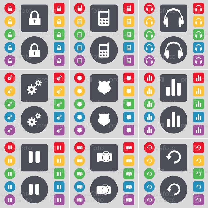 Замок, мобильный телефон, наушники, снаряжение, полицейский жетон, диаграмма, пауза, камеры, перезагрузить значок символа. Большой набор плоских, цветные кнопки для вашего дизайна. Вектор